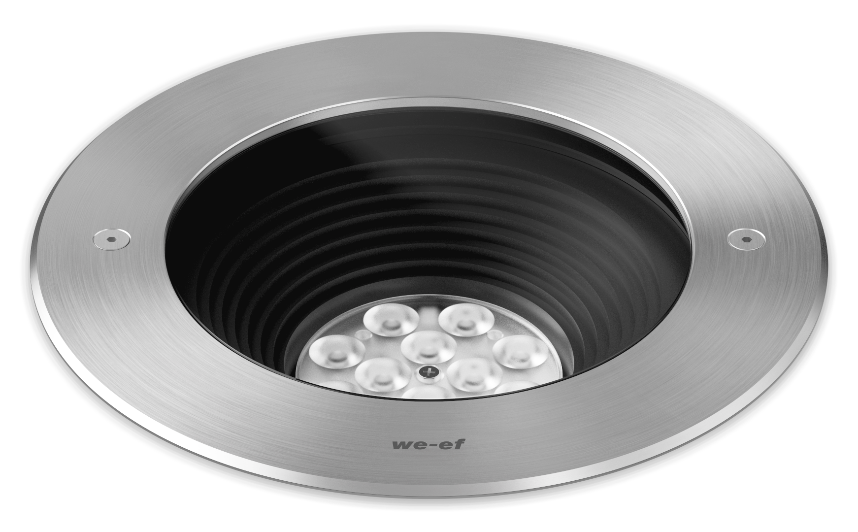 RGBW Colour Changer. IP69. IK10+. Stainless steel construction including PCS hardware. Safety glass lens; max. load 5 tonnes. Luminaire can be driven over at low speed. Silicone rubber gasket. Anti-wick technology, equipped with a cable gland and 0.5 meters of flexible, PVC-free cable. Integral EC electronic converter. Advanced thermal management protects LEDs while optimising lumens output. Removable LED boards for upgrading. CAD-optimised optics for superior illumination and glare control. OLC® One LED Concept. LED circuit board with WE-EF Colour Boost Technology. DMX Interface. For other control interface options to suit specific project requirements, contact WE-EF. Luminaire installation blockout and sealable junction box included in supply.