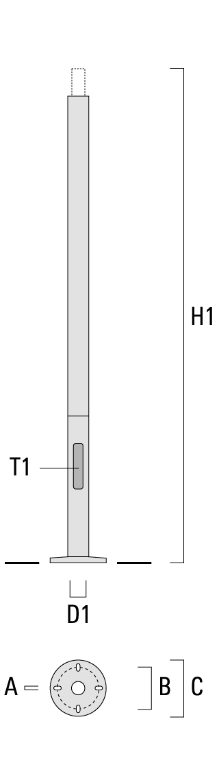 Tubular steel, constant section, hot dipped galvanised. 5CE+Primer superior corrosion protection, including PCS hardware. Powdercoat finish in black RAL 9004, grey aluminium RAL 9007, anthracite grey RAL 7016 or white RAL 9016. Surface mounting flange plate with die-cast aluminium cover to conceal mounting hardware. Service door.<br><br>
