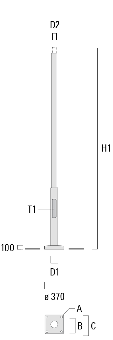 Tubular aluminium, stepped. 5CE+Primer superior corrosion protection, including PCS hardware. Powdercoat finish in black RAL 9004, grey aluminium RAL 9007, anthracite grey RAL 7016 or white RAL 9016. Surface mounting die-cast aluminium base with covers to conceal mounting hardware. Service door.<br><br>