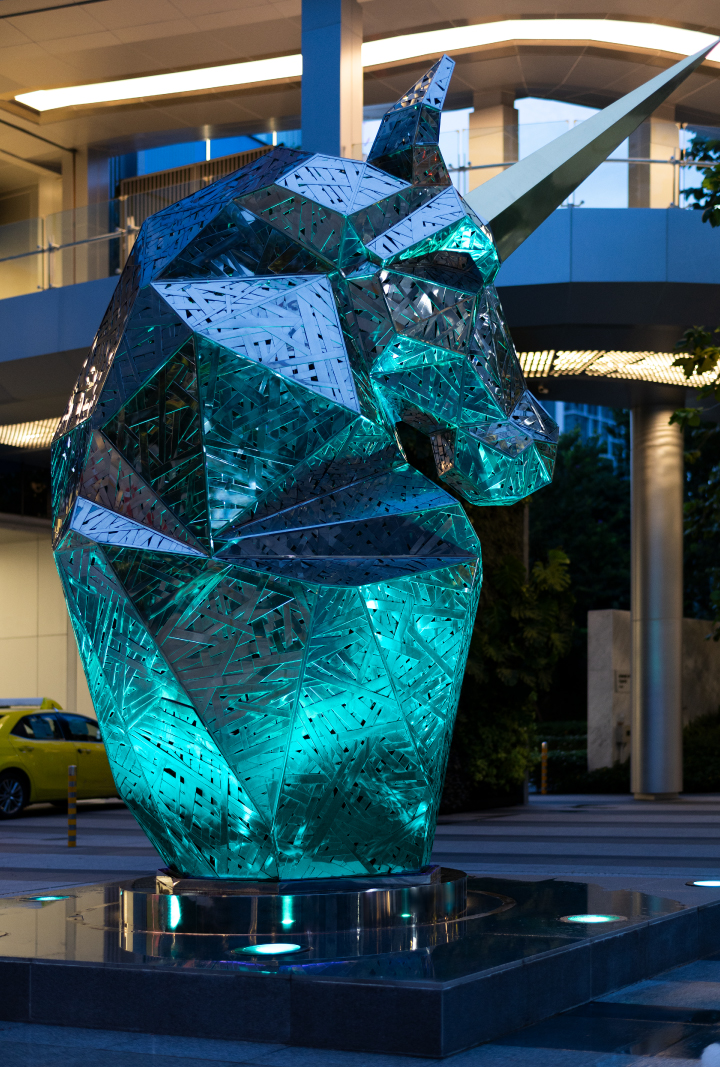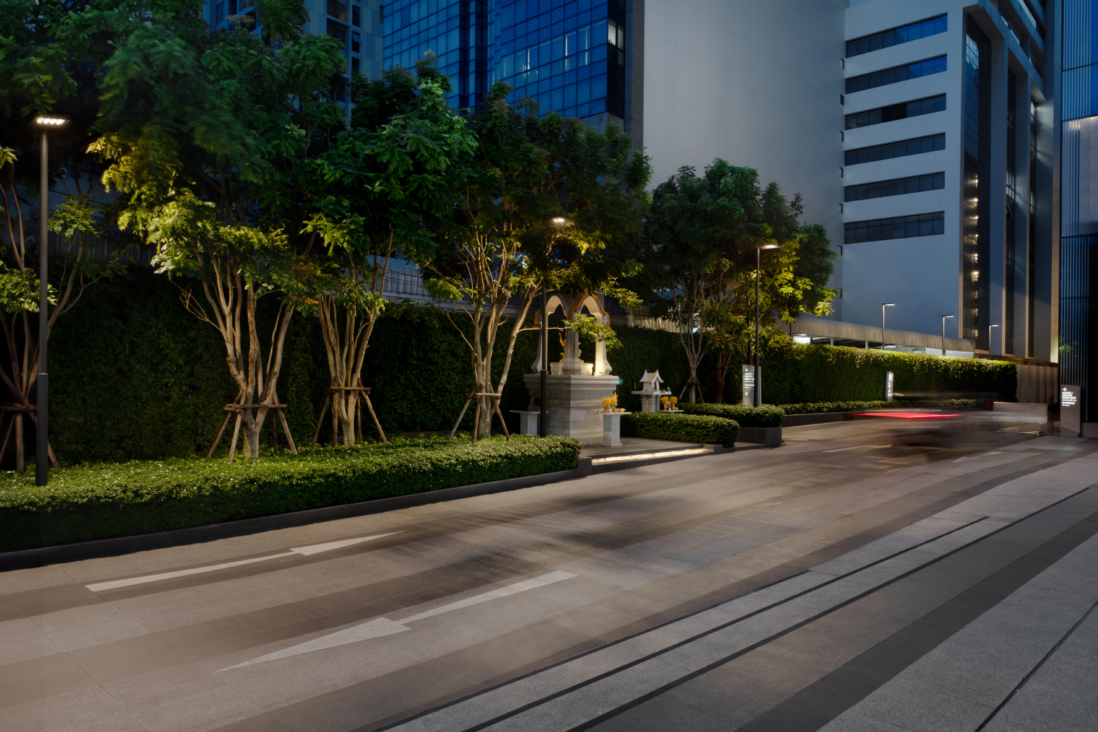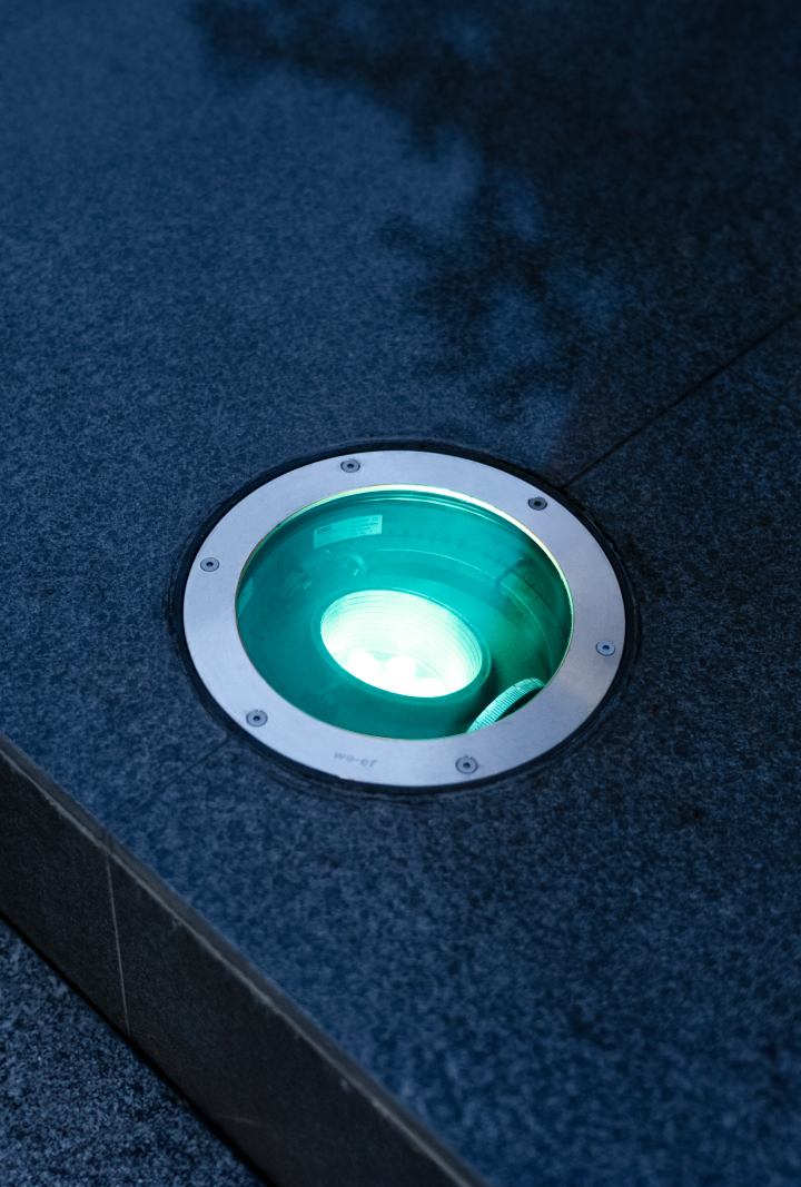 The Unicorn sculpture is the focal point in front of the new office, retail, and hotel building – The Unicorn Bangkok. Made from shiny, stainless steel, the Unicorn sculpture provides a wonderfully reflective surface which allows for natural light in the day and colourful dynamic lighting at night to continuously highlight the many angled surfaces of the sculpture. This creates a stunning visual landmark to visitors approaching at ground level as well as those making their way to The Unicorn via the conveniently located skywalk bridge from the nearby BTS station. Using compact yet powerful WE-EF inground ETC340-GB CC adjustable luminaires, the designer was able to achieve precise and dynamic colourful lighting to illuminate the full 4-metre height of the sculpture. The designer also chose WE-EF because of the trust they have in the reliability of our inground luminaires to withstand the worst of the weather conditions without affecting the luminaires’ performance.
