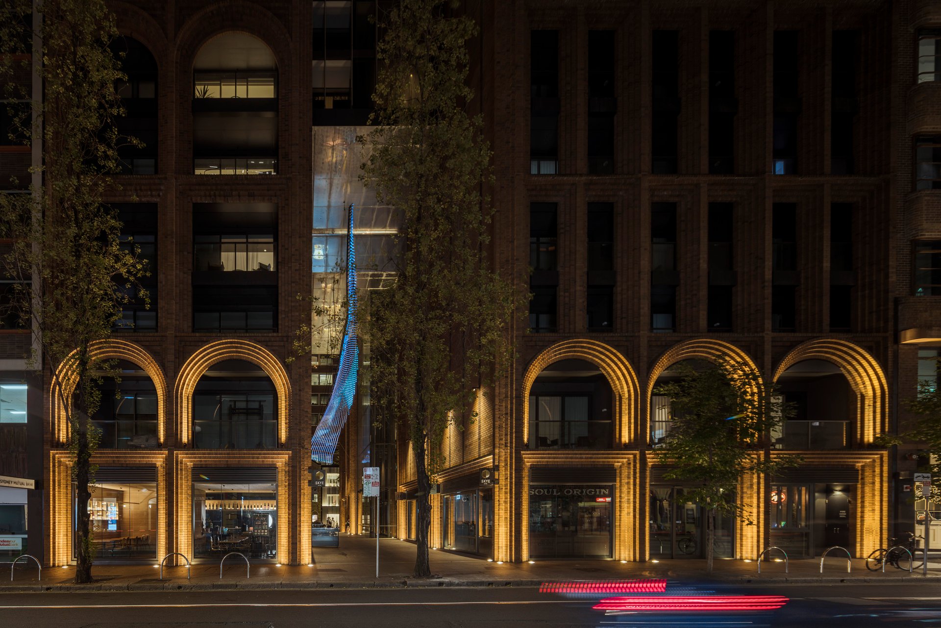 In the heart of Sydney’s CBD sits an architectural award-winning brick masterpiece composed of over 300,000 bricks and spanning the width of an entire block, characterised by its unique sculptured arches. Created for Crown Group, the inspired brick façade pays homage to the historic Sydney buildings, while still exuding a modern inner-city living feel. The delicate detailing of the Bowral bricks used, and the red tones bring warmth to the suburban jungle that is the Sydney CBD. For this project, the lighting design challenge was to enhance that balance between old and new and accentuate the beautiful arches.