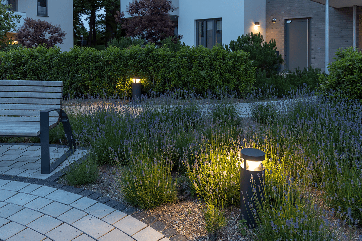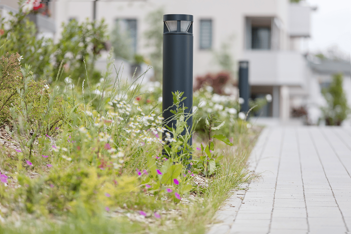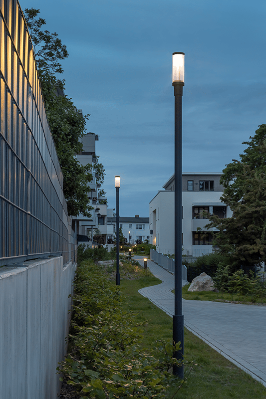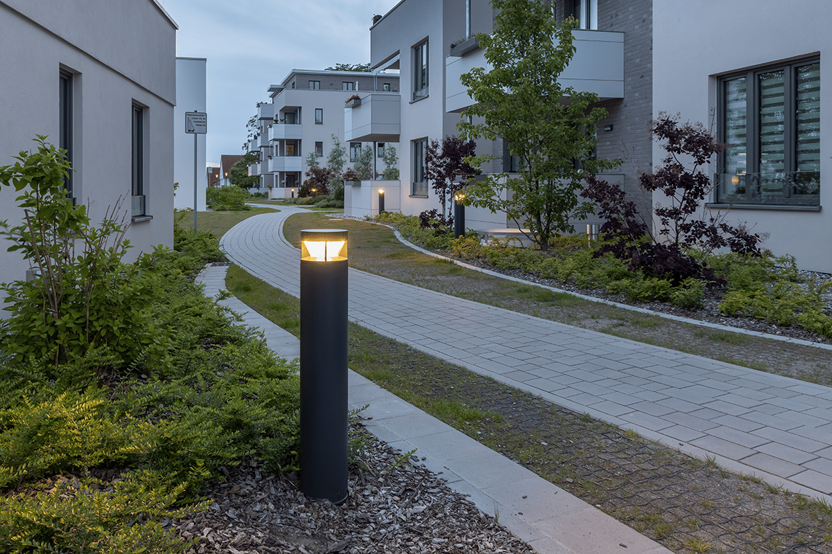 Was diesem Gebäudeensemble seinen Namen gab, sind seine kleinen, grünen Oasen, die die Häuser auf natürliche Weise miteinander verbinden. Innerhalb der Anlage folgen die Wege sanft geschwungenen Linien. Zum Einsatz kommen KTY234 LED Pollerleuchten, die eine asymmetrisch vorwärts breitstrahlend gerichtete [R65] Lichtverteilung erzeugen. Die Wegbeleuchtung erfolgt mit 100 cm hohen KTY Pollerleuchten, für den Bereich der grünen Inseln wurde das gleiche Modell in der niedrigeren Baugröße mit 60 cm Höhe verwendet. Das Beleuchtungsniveau ist dort etwas angehoben, um einen Blickfang zu bilden und die Anwohner zum Verweilen einzuladen.