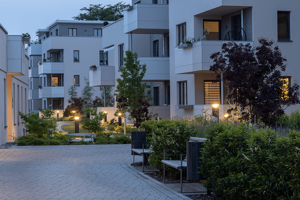 Mit Billrothgarten entstand eine neue Wohnanlage in Bergen auf der Ostseeinsel Rügen. Der moderne Komplex besteht aus fünf Mehrfamilienhäusern mit insgesamt 80 Wohnungen, die zentrumsnah gelegen sind und gleichzeitig den Bewohnern einen ruhigen Rückzugsort bieten. Das Beleuchtungskonzept aus Poller- und Mastleuchten von WE-EF schenkt Orientierung und sorgt für eine stimmungsvolle Atmosphäre.
