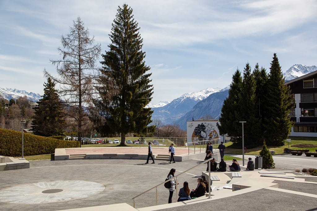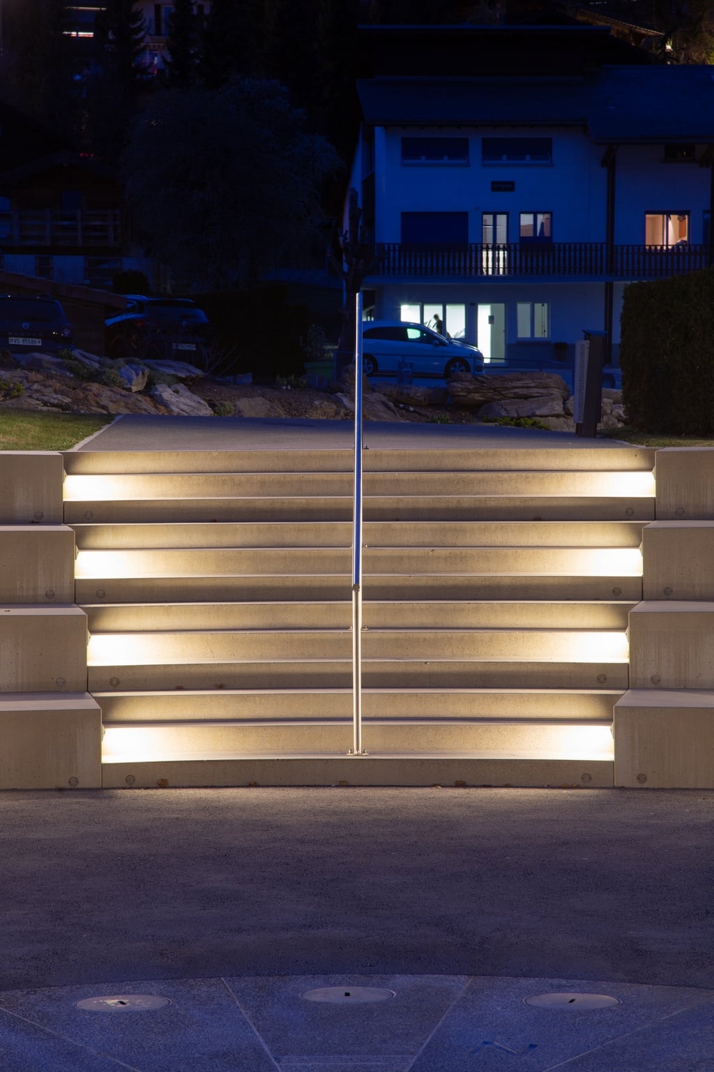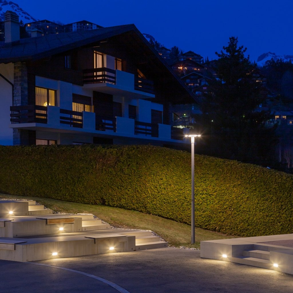 Pour bien répondre à cette demande, il est nécessaire de prendre en compte le contexte du lieu de vie. Ici, il s’agit d’une place proposant un amphithéâtre en extérieur au milieu de Bluche à côté de Crans-Montana célèbre station touristique du canton du Valais en Suisse. Offrant un magnifique point de vue sur les Alpes Valaisannes, ce lieu de passage et de rassemblement prolonge l’entrée de l’école de management hôtelier « Les Roches » et est souvent occupé par les étudiants lors de leurs pauses. Afin de prolonger ces activités le soir, l’éclairage se doit d’être à la hauteur et c’est pourquoi des encastrés muraux STP de WE-EF et des lanternes CFT530 sont installés et apportent notamment de la sécurité aux zones pourvues d’escaliers. L’ensemble forme une empreinte visuelle graphique parfaitement intégrée à la géométrie ronde du lieu. L’ensemble est homogène et discret et ne vient pas alourdir le paysage alpin.