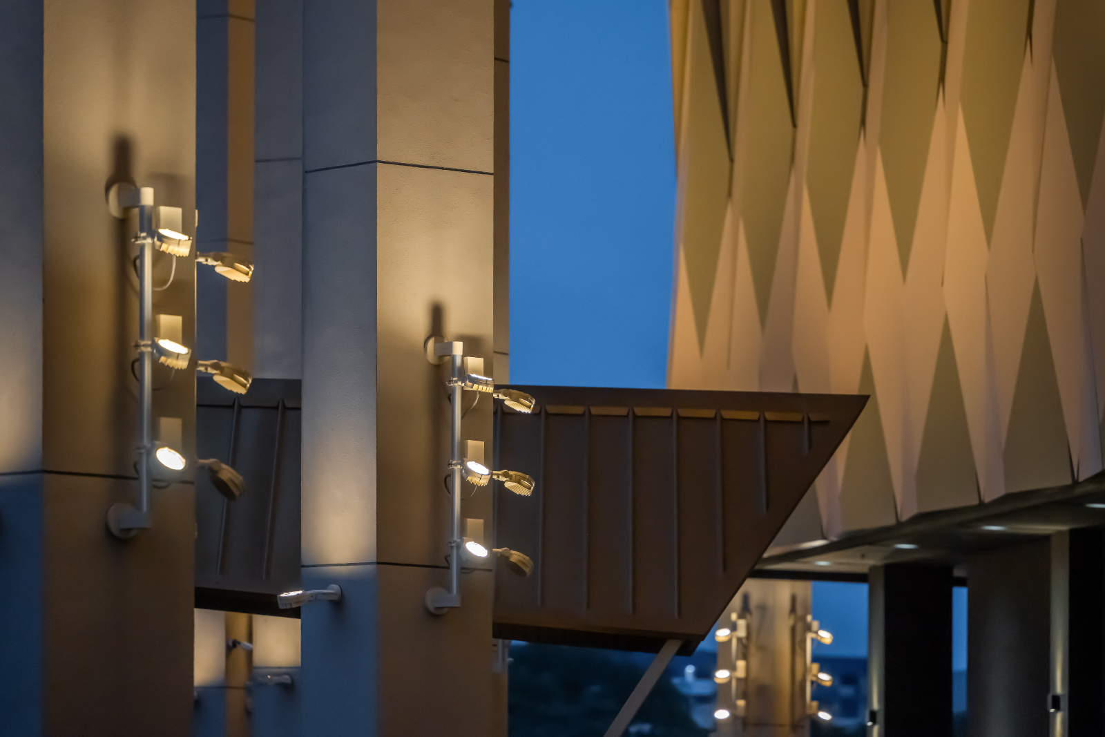 This five-storey building is designed in a modern style, incorporating black-and-gold diamond pattern cladding inspired by Sarawakian craft motifs. To create eye-catching pulsations of light on the three-dimensional cladding, and accentuate the warm glow to the arch façade, FLC141 projectors in combination with the RAIL66 mounting system and FLC141 with flat surface fitter were the ideal choice for their ability to highlight detail from afar. The result is perfect harmony where the lighting fixtures blend seamlessly with the environment while enhancing the architectural features as intended.