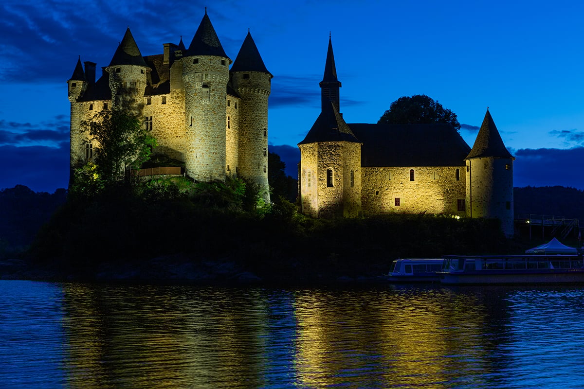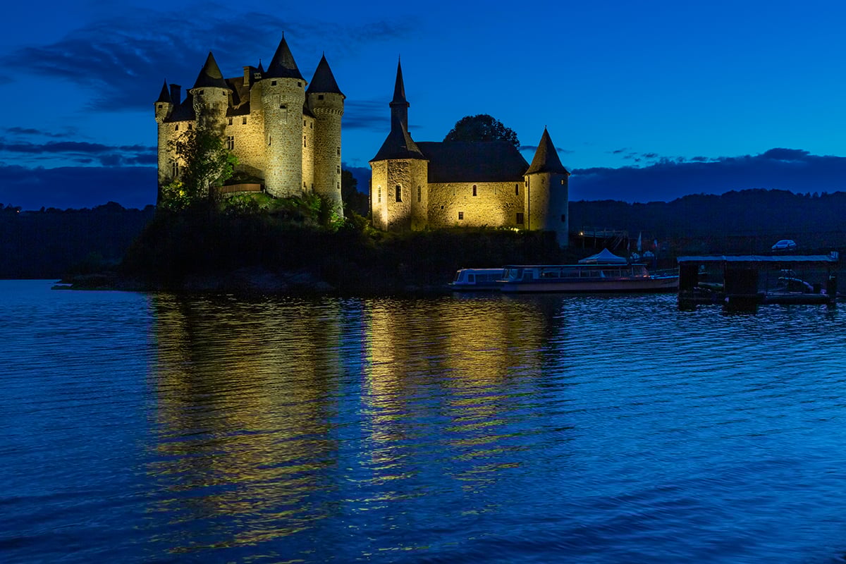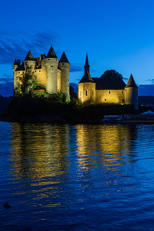 Niché sur un rocher de 30m de haut, le château de Val est situé sur le rivage du lac artificiel de Bort-les-Orgues dans le Cantal.