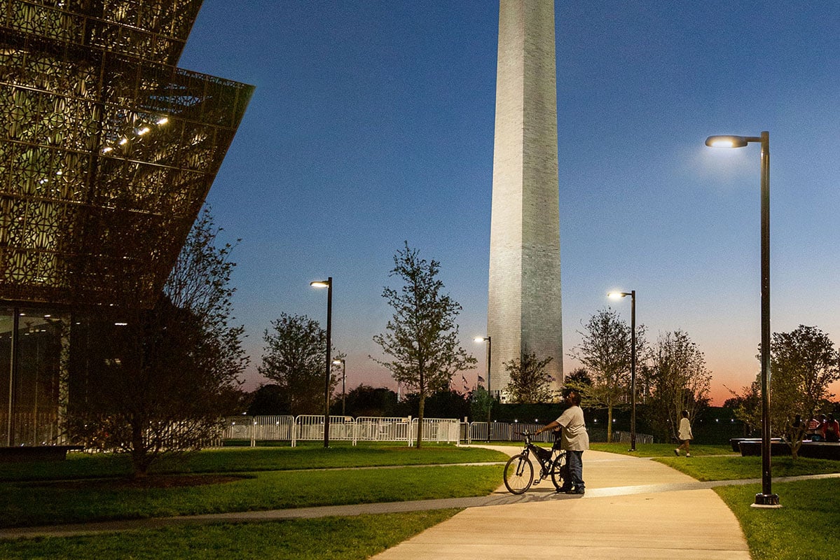 Die installierten RFL540 LED Mastleuchten erfüllen exakt diese Anforderungen. Ausgestattet mit CAD-optimierten [S70] Linsen aus PMMA erzeugen sie eine asymmetrische seitliche, homogene Lichtverteilung und lenken das Licht exakt dorthin, wo es erwünscht und gebraucht wird. Eine zusätzliche Anforderung der Lichtplaner von FMS Fisher Marantz Stone betraf die Farbwiedergabe der Lichtquelle. Die verwendeten LEDs weisen, abgestimmt auf den Bronzeglanz der Fassade und auf die warmtonigen Pflastersteine, eine Farbtemperatur von 3000 K auf. Juergen Boenisch, Geschäftsführer von WE-EF LIGHTING USA zum Lichtkonzept: „Das Smithsonian’s National Museum of African American History and Culture ist eine wichtige Institution und wir fühlen uns geehrt, mit unseren Leuchten ein Teil davon zu sein.“