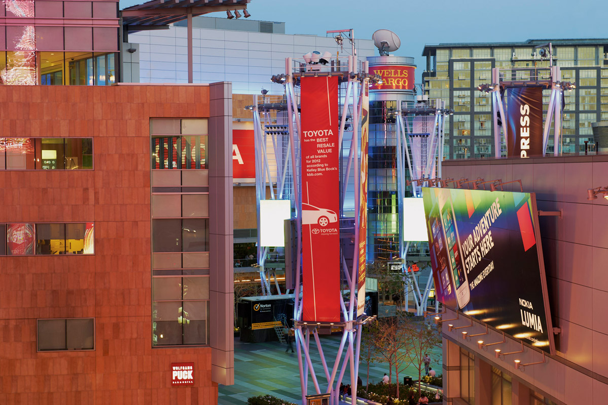 FLC240 projectors provide effective lighting solutions for the many different sizes of dynamic billboards that characterize LA Live. The projectors – with both symmetric very narrow and medium distribution beams, and 70 W metal halide lamps – are arranged to achieve ideal lighting levels. The superior performance of WE-EF's IOS Innovative Optical System ensures uniform illumination across large surface areas with greater mounting distances between the luminaires.
