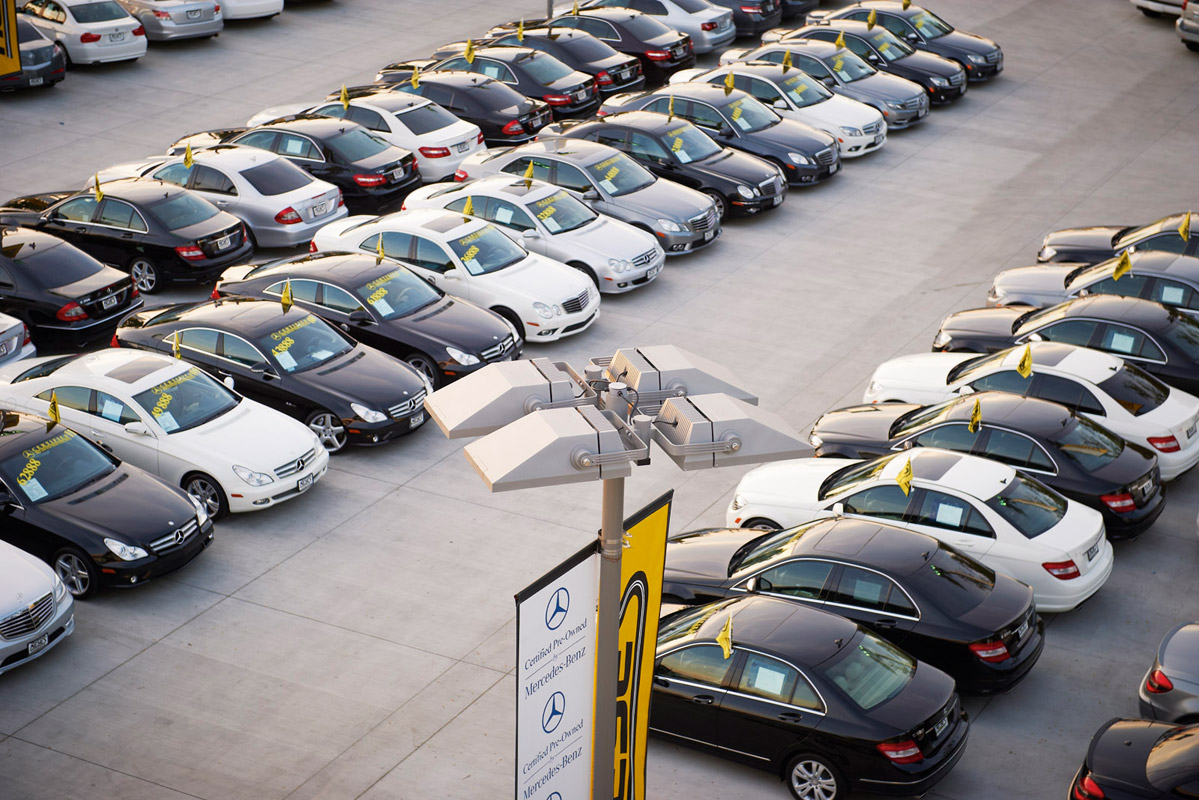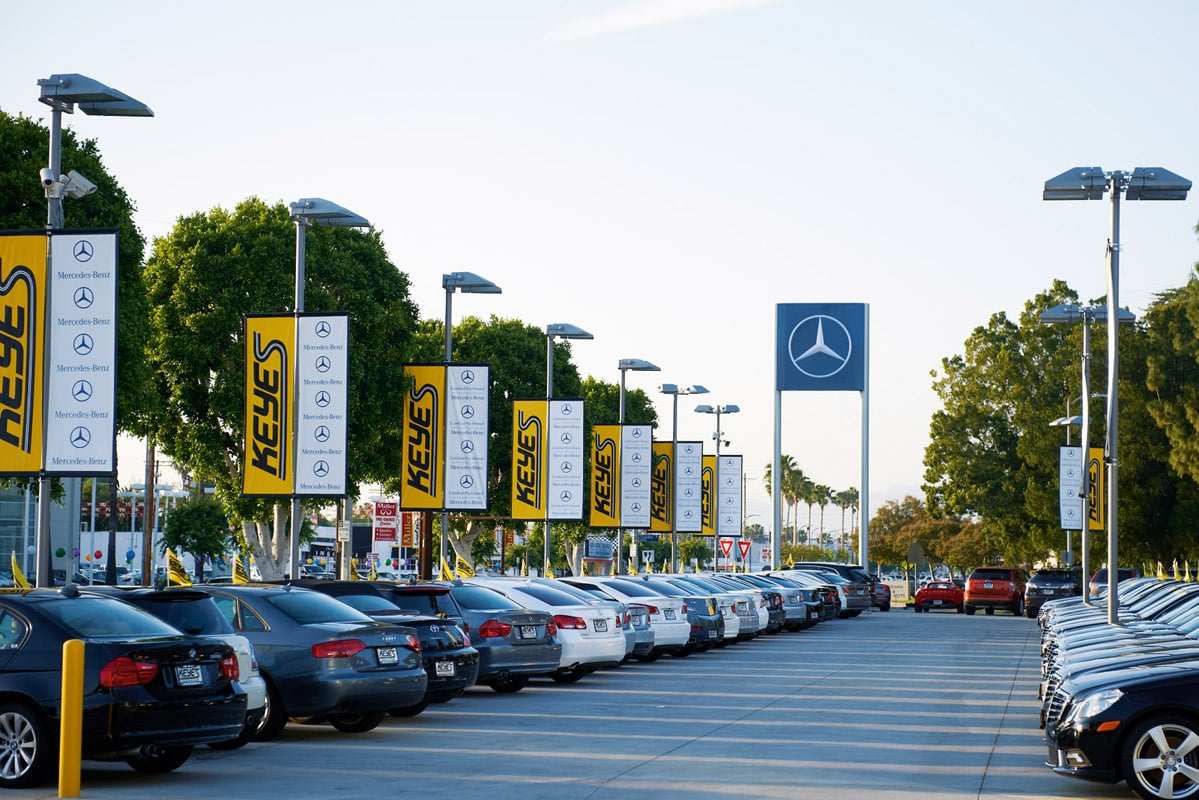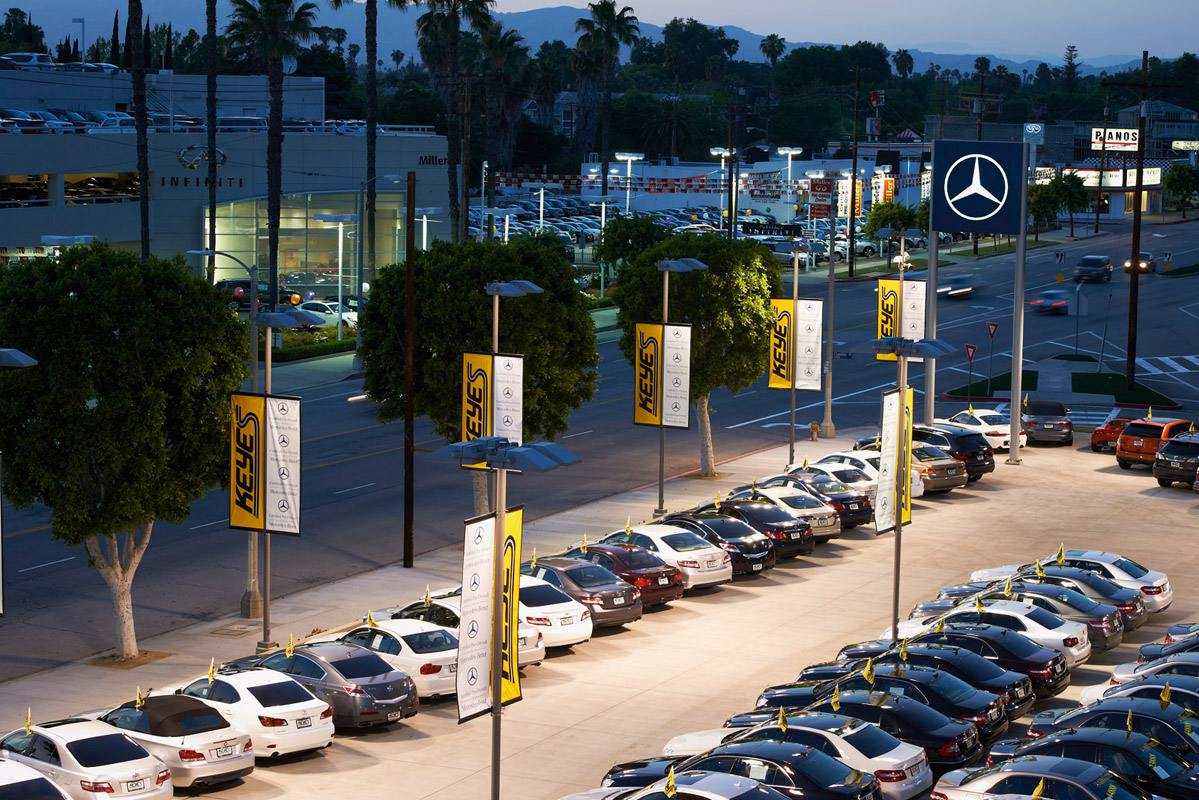 Der Full-Service-Mercedes-Händler Keyes European in Los Angeles setzt auf die aufmerksamkeitsstarke Präsentation seiner Neu- und Gebrauchtwagen. Die Beleuchtung des Außengeländes übernehmen FLA780 Scheinwerfer von WE-EF.