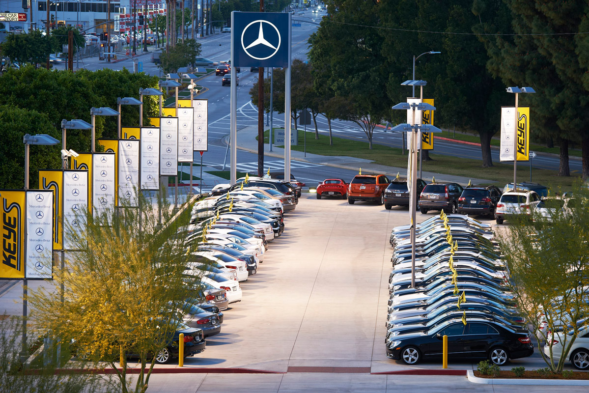 Etwa 35 Millionen US-Dollar hat Keyes European in seinen Flagship-Store am Van Nuys Boulevard in Los Angeles investiert. Das Angebot auf 20.000 m2 umfasst viele Fahrzeuge der S-Klasse, aber auch Modelle der High-Performance-Marke AMG. Passend zu diesen Exponaten haben die Architekten von Dennis Flynn Architects, Inc. und die Lichtplaner von Lighting Design Alliance für Autohaus und Freigelände ein Gestaltungskonzept entworfen, das der Idee einer Museumspräsentation folgt. Wie Prunkstücke in einem Schmuckkästchen werden die Wagen ausgestellt und sollen die Neugier von Stammkunden und Passanten auf sich ziehen.
