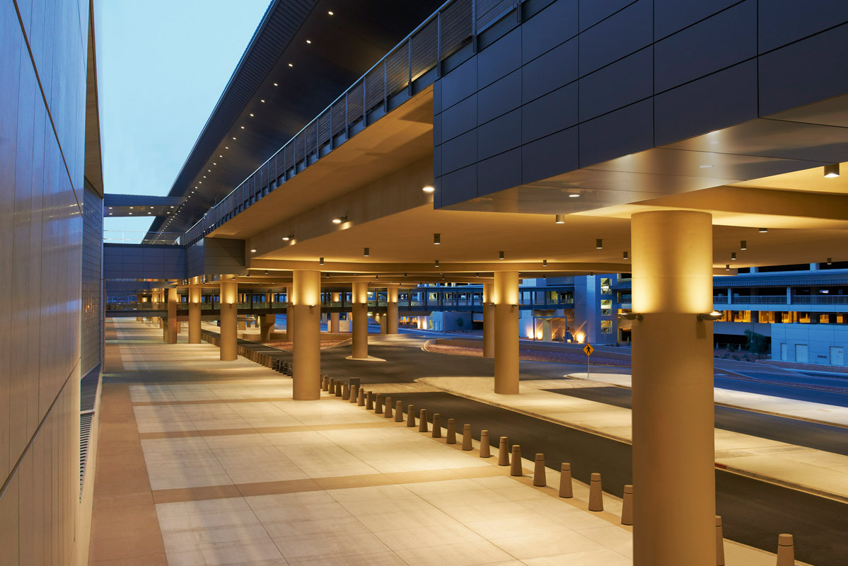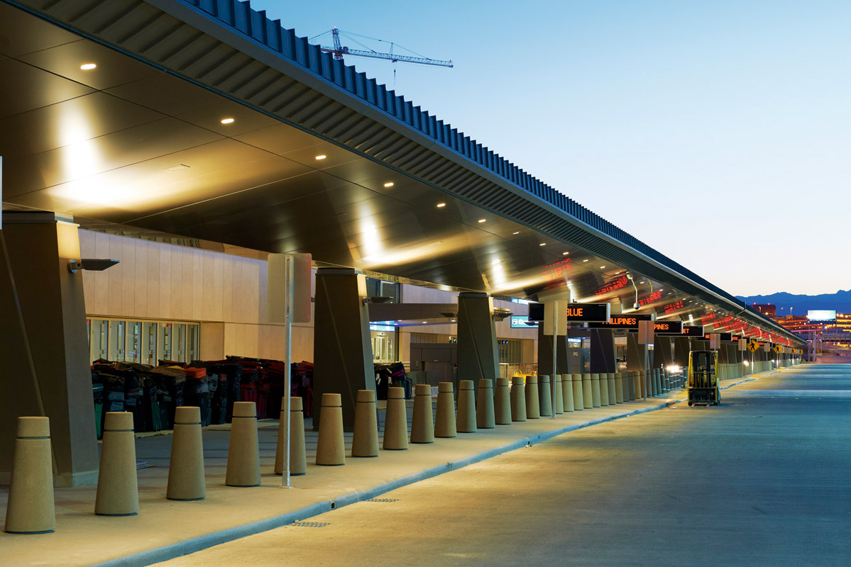 Mit seiner kantigen Form erinnert der neue Terminal 3 des McCarran International Airports an die zerklüftete Landschaft von Nevada: Felsformationen, Erosion und Geländeeinschnitte inspirierten die Architekten von PGAL zu ihrem Entwurf. Durch Oberlichter mit 1.444 m² Fläche fällt das Tageslicht ähnlich wie durch Felsspalten in einen Canyon, Gitterroste sorgen dabei für Abschattung. Die verglaste Stirnseite bietet einen Ausblick auf den berühmten „Strip“ von Las Vegas, 300 Spielautomaten stimmen bereits im Terminal auf die Glücksspiel-Metropole ein. Der Terminal verfügt über 3 Ebenen, 14 Gates und ein 8-stöckiges Parkhaus auf einer Grundfläche von etwa 186.000 m². Damit trägt es spürbar zur Entlastung des Flughafens bei, der mit rund 48 Millionen Fluggästen pro Jahr zu den 10 frequentiertesten der USA gehört. Das Abfertigungsgebäude beeindruckt mit flexibler und fortschrittlicher Infrastruktur: So sind die Gates von den Fluggesellschaften frei belegbar und ein hochmodernes Gepäcktransportsystem erhöht die Effizienz.