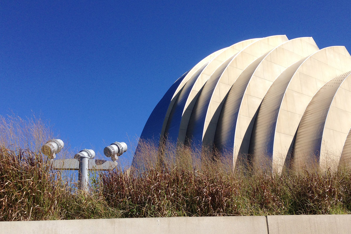 The Muriel Kauffman Theater and Helzberg Hall are two discrete buildings suited to their distinct purposes, but harmoniously tied together with a glazed foyer and magnificent glass lobby wall. As a whole, these two south-facing theaters create a dramatic shell-like structure on a hilltop with views of Kansas City. Their dynamic waves reflect natural light and hint at the motion and grandeur that guests will experience inside. For all the majesty of the architecture, the interior of the theaters is warm and intimate. Outdoor performances and a public gathering space are situated on five acres of green lawn surrounding the Center.