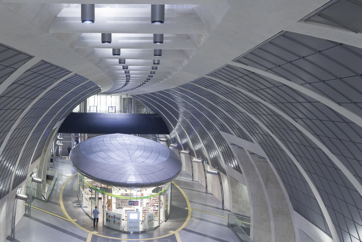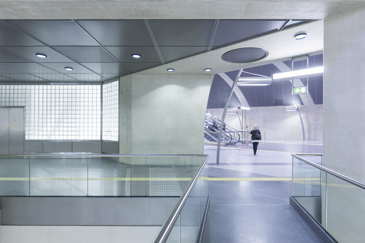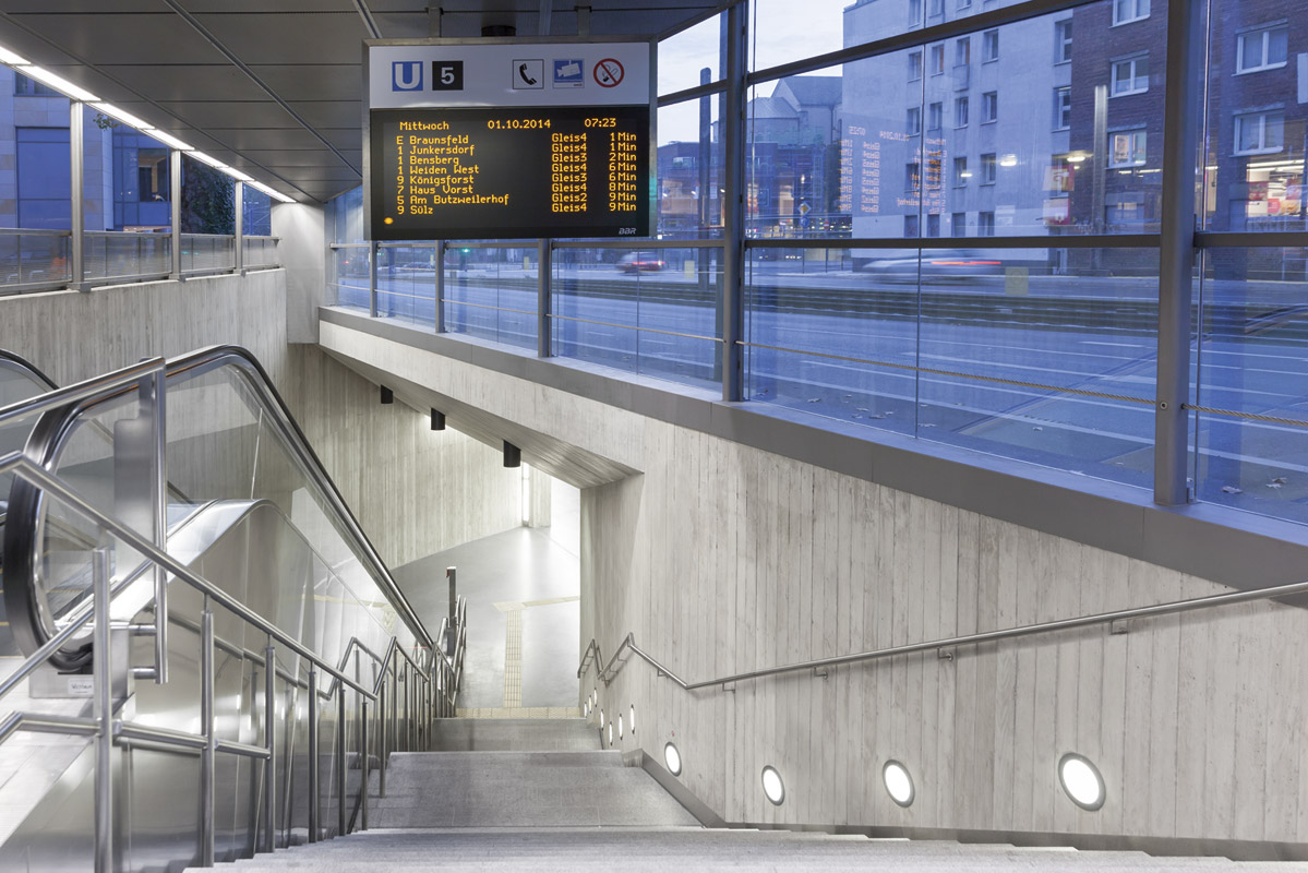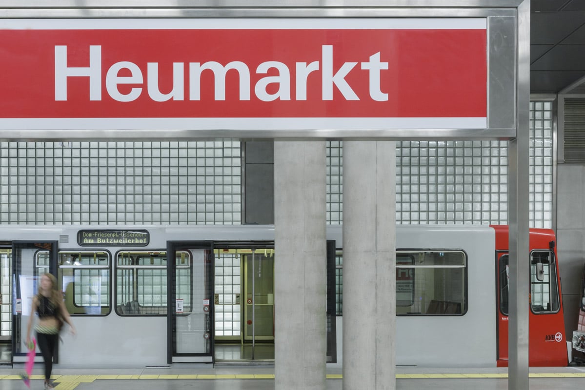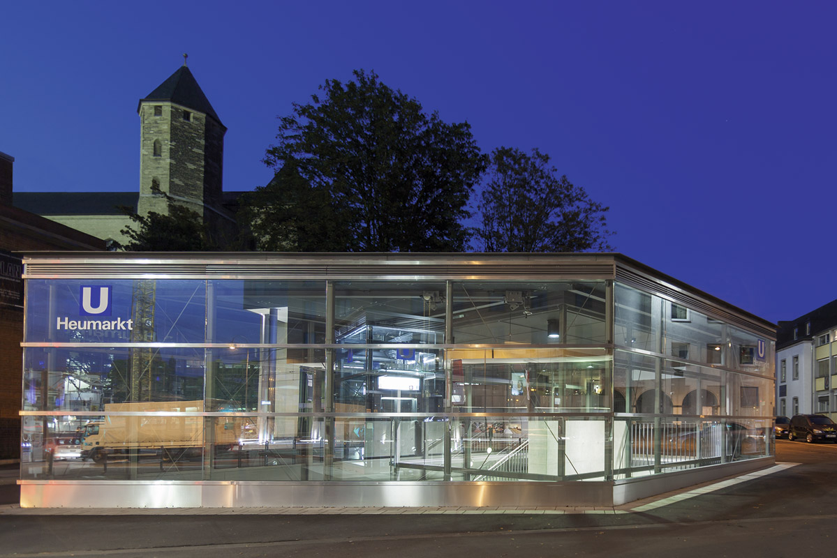 Überraschend groß und von einem Gewölbe überspannt, erinnert die Halle im oberen Geschoss des neuen U-Bahnhofs Heumarkt an ein Kirchenschiff. In der Realität dient es jedoch rein weltlichen Zwecken, nämlich als Zugang zum tiefer gelegenen Bahnsteig und als Standort für einen 300qm großen Verkaufspavillon. Sollte Kölns Zugverkehr in Ost-West-Richtung eines Tages auch unter die Erde verlegt werden, dann wird aus der heutigen Zwischenebene ein Bahnhof. Ihre Dynamik und Lebendigkeit bezieht die Architektur der Station Heumarkt aber nicht nur aus der schwungvollen Kuppelhalle, sondern auch aus den zahlreichen Durchbrüchen und Blickachsen, die immer wieder neue Perspektiven eröffnen. Von manchen Standorten aus lässt sich die gesamte Höhe des Baus erfassen – vom tiefliegenden Nord-Süd-Bahnsteig, über die Zwischenebene bis hin zu den gläsernen Treppenhäusern, die an die Oberfläche führen und über die Tageslicht einfällt.
