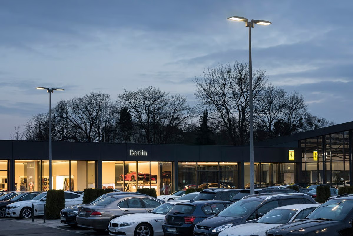Previously two vertical floodlights, each fitted with one 1000 W HIT lamp, illuminated the open-air show lot from the side. These will now be replaced with WE-EF PFL240 LED luminaires, providing even illumination of the area. The customer not only chose to upgrade the lamp technology, but also to install new post top luminaires in the centre of the space. Each 8 m-high post in the centre of the show lot is topped with two luminaires, whilst the 10 m-high posts at the perimeter are also fitted with two luminaires each. This project was carried out using 48 LEDs and 144 W power consumption. The A60 lens generates an asymmetric ´forward throw` distribution. On the posts in the centre of the area, the luminaires are offset by 180°, whereas at the perimeter they were aligned with one another at a 90° angle. Overall the entire open-air showroom is illuminated evenly and without generating glare that could dazzle passing traffic or neighbours.