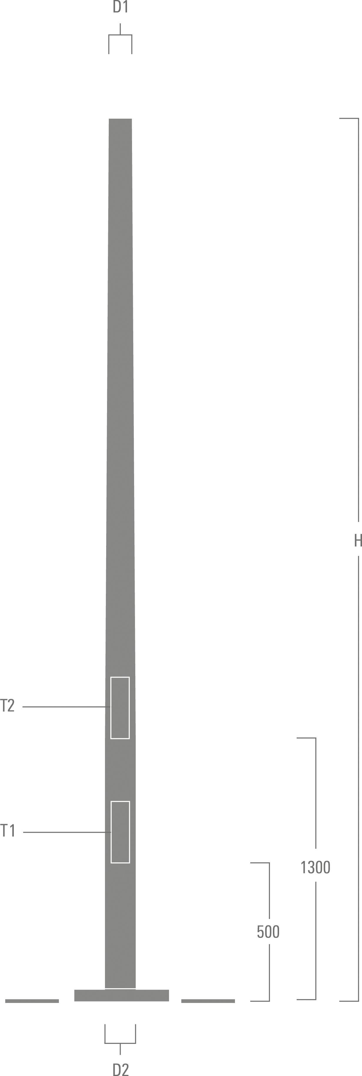 5CE, 5CE+Primer en option. Avec semelle et ouverture d'entrée de câble. Porte de visite avec vis de fermeture (à trois pans) en acier inoxydable et barrette interne pour pose d’un coffret pied de mât.