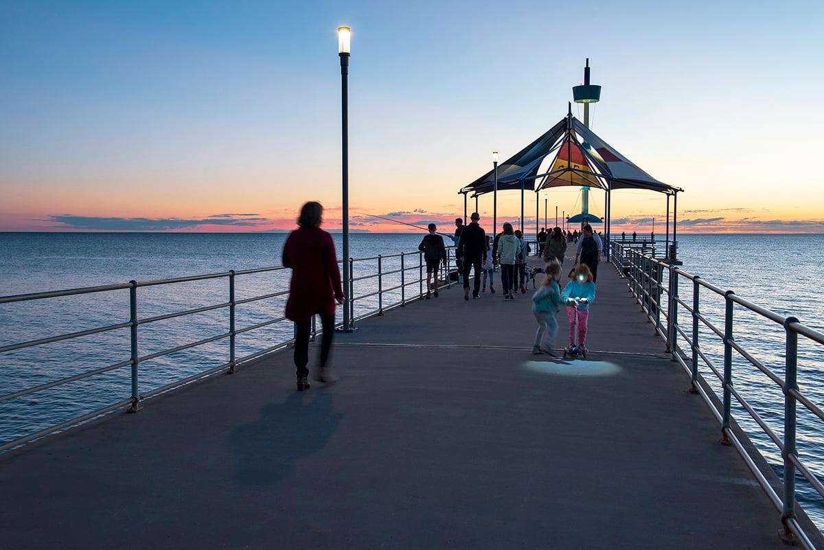 Brighton, une banlieue côtière d'Adélaïde en Australie recèle de multiples attractions. Au-delà de la plage de sable fin, de l'eau cristalline et de la promenade pittoresque, une jetée surplombe la mer sur 200 mètres. Depuis 1886, la Brighton Jetty séduit les flâneurs, les pêcheurs et les baigneurs. En 1994, cette jetée a néanmoins dû être complètement reconstruite en raison des dommages causés par la tempête. Les lampes installées au cours de cette rénovation ont été remplacées par des luminaires LED WE-EF de haute qualité. « La Ville d'Holdfast Bay, dont fait partie Brighton, a déjà pu apprécier la qualité et les performances des luminaires WE-EF. La protection anti-corrosion 5CE a évidemment constitué un critère décisif pour ce projet réalisé directement en bord de mer », explique Andrew Richardson, éclairagiste chez WE-EF. Les responsables avaient même déjà opté pour un type de luminaire particulier WE-EF : les lanternes ZFT434 LED. C'était un excellent choix en termes de design. La ZFT434 LED, avec sa tête de luminaire cylindrique transparente et ses points lumineux LED, convient parfaitement à la jetée de Brighton.