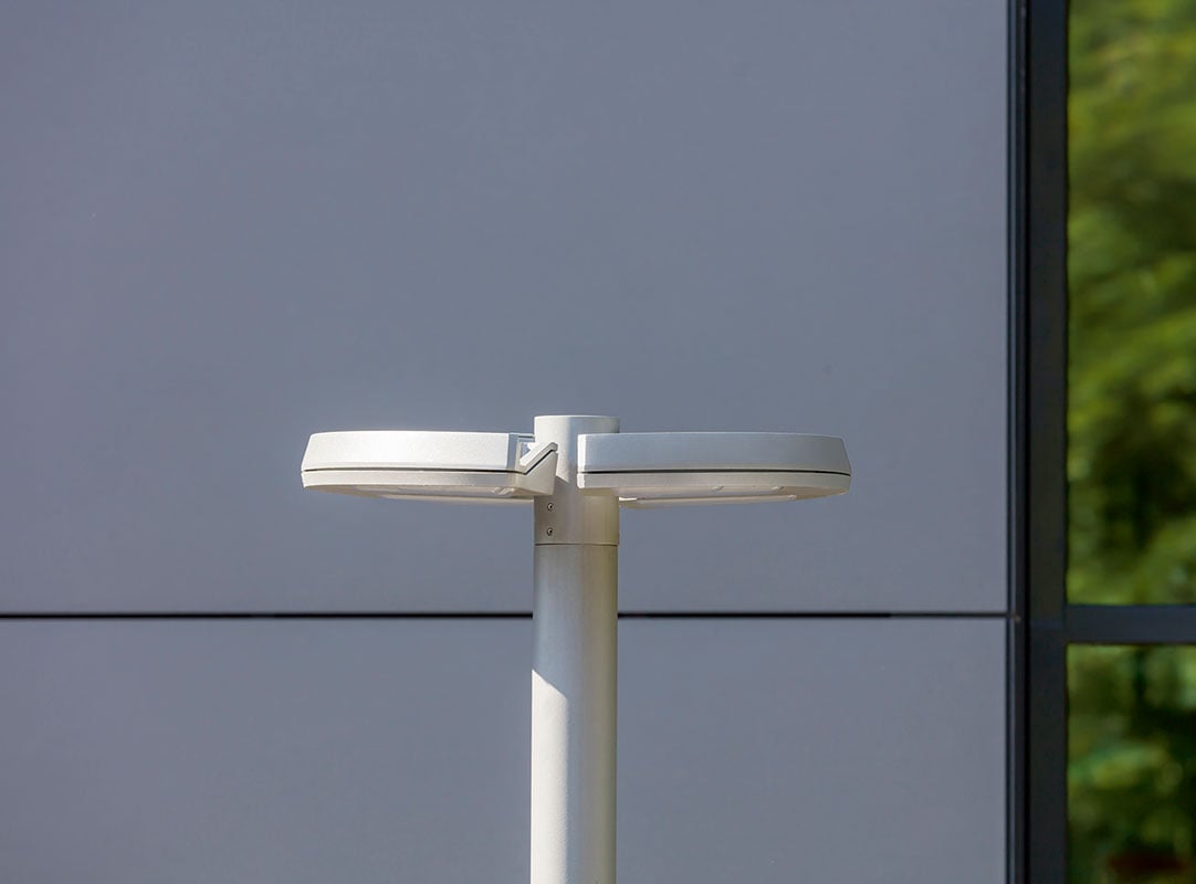 Des lanternes sur mât RMC320 LED sont utilisées dans l’espace extérieur aux allures de parc, situé à l'arrière du bâtiment et à la sortie arrière. Les mâts se trouvant à proximité immédiate de la façade sont équipés de luminaires semi-circulaires. Ces luminaires isolés (par exemple au niveau du bassin extérieur) sont montés sur des structures de mât doubles. Par ailleurs, ils y sont également employés comme appliques murales. Les hauteurs de mât, les puissances et les photométries sont adaptées avec précision en fonction de chaque emplacement. Tous les luminaires extérieurs sont équipés d’une gradation avec l’interface DALI.