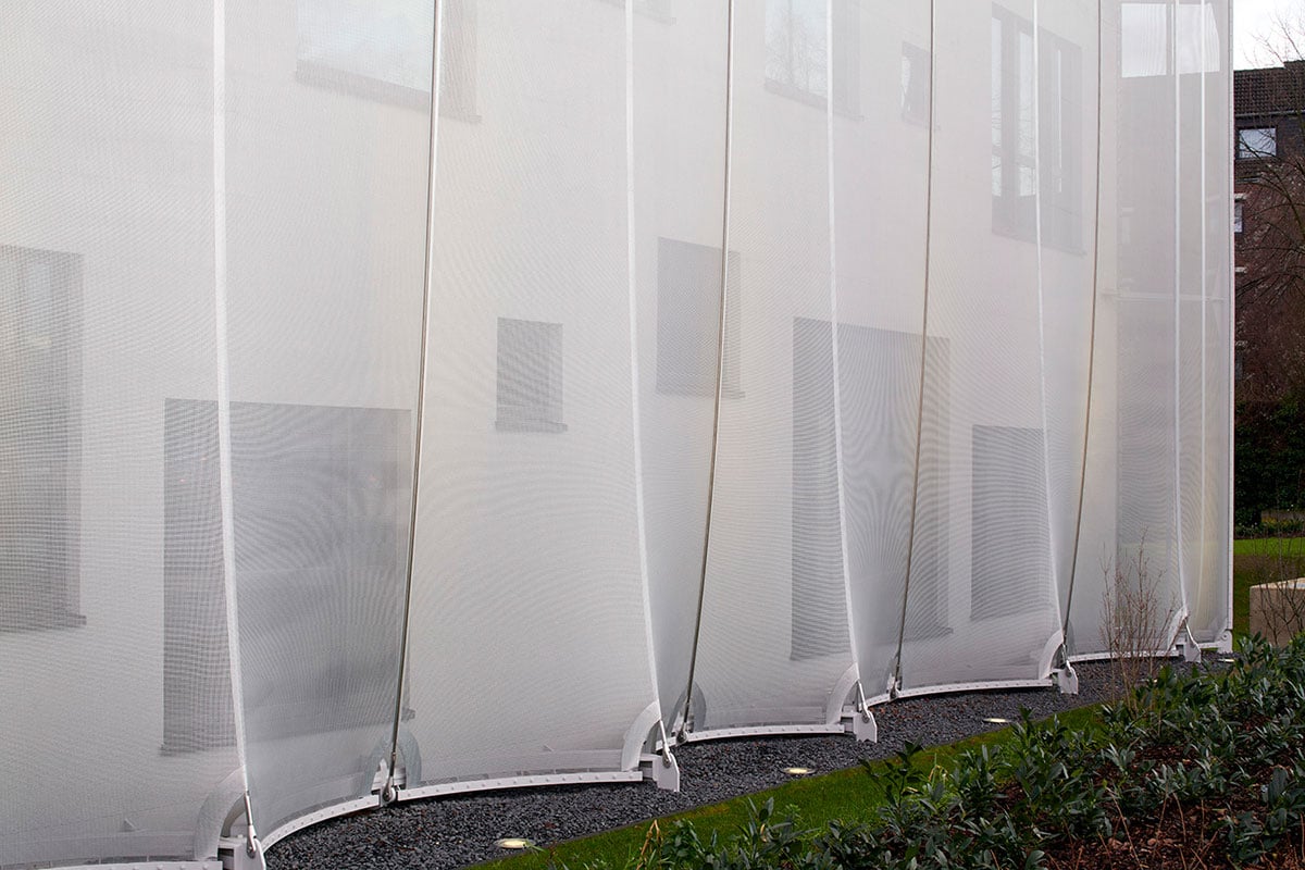 Mönchengladbach est un haut lieu de l’industrie textile traditionnelle. Sur le campus de l’université Niederrhein se trouve le nouveau bâtiment de l’académie du textile NRW, une école professionnelle privée financée par des associations régionales. Le bureau d’architecture Slapa Oberholz Pszczulny SOP (Düsseldorf) a conçu une construction avec une symbolique très forte, sous la forme d'une enveloppe textile se fondant dans ce bâtiment fonctionnel comme une robe sur mesure aux reflets argentés. La membrane de 2100 m² est constituée de différents lés de tissu qui, tendus en alternance devant et derrière les cordes, forment un motif ondulé irrégulier.