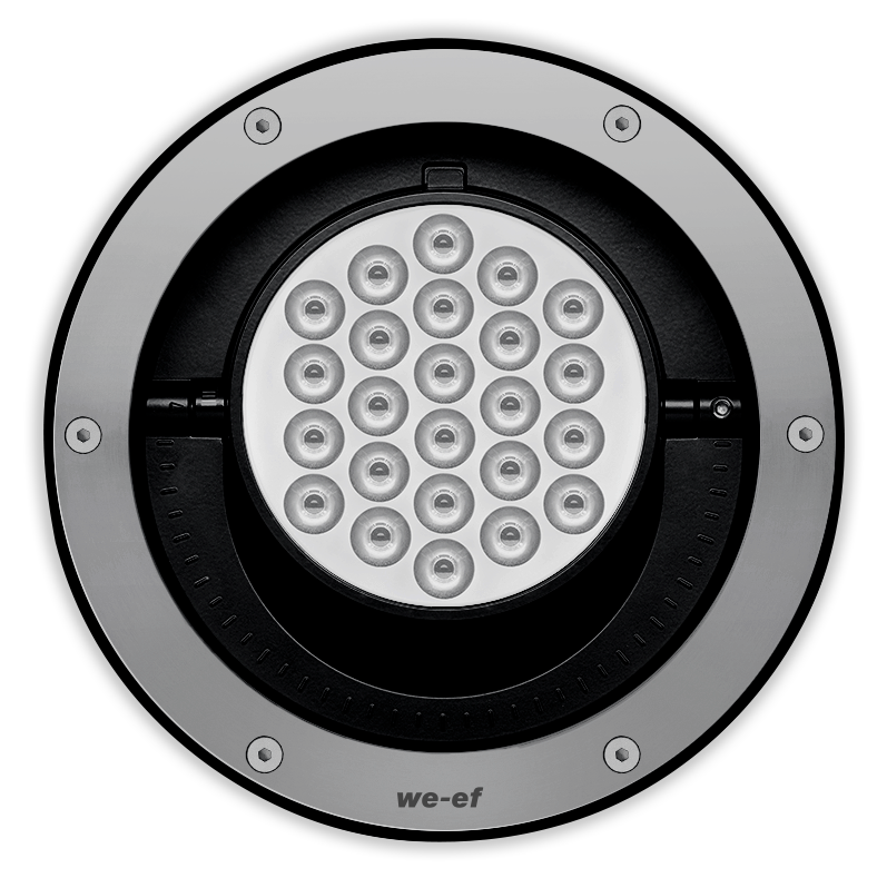 Tunable White. IP69K. Class I. IK10+. Stainless steel construction. PCS hardware. Optional with Anti-Slip ceramic Coating ASC to DIN 51130 (Trip Classification 10) available on request. Silicone CCG® Controlled Compression Gasket. Safety glass lens; max load 5.5 tons (11,000 lbs). Luminaire can be driven over at low speed. Cable gland with spiral cable bending protection. Factory-sealed termination chamber complete with cable gland and 3 ft of flexible PVC-free, gel-impregnated anti-wicking cable. CAD-optimized optics for superior illumination and glare control. Integral driver, thermally separated. OLC® One LED Concept. Factory-installed LED circuit board. Tunable White technology. DMX Controlled. Gimbal mounted, 360° rotatable and 30° tiltable. The concrete-pour installation blockout is supplied as standard with luminaire. Specify product with 7 Digit product code – Finish Color. Accessories, such as mounting, optical, and electrical, must be specified separately. Example: XXX-XXXX-9004 (Black) + XXX-XXXX (Accessory 1)