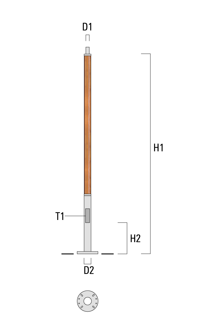 Impregnated Mahogany (MA) straight round pole. Base section made of tubular steel, hot dipped galvanized inside and outside. Chromated with superior powdercoat finish in black RAL 9004, grey metallic RAL 9007, white RAL 9016 or dark bronze 8019. Specify finish. Consult WE-EF color chart for other options. Service door with stainless steel locking hardware. Base plate welded to tubular shaft.