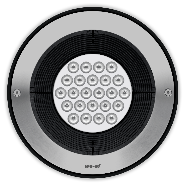RGBW Colour Changer. IP67, Class I. IK10+. Stainless steel construction including PCS hardware. Safety glass lens; max. load 5 tonnes. Luminaire can be driven over at low speed. Silicone rubber gasket. Factory-sealed termination chamber complete with cable gland and 0.5 m of flexible PVC free cable. Integral EC electronic converter. Advanced thermal management protects LEDs while optimising lumens output. Removable LED boards for upgrading. CAD-optimised optics for superior illumination and glare control. OLC_R_ One LED Concept. LED circuit board with WE-EF Colour Boost Technology. DMX Interface. For other control interface options to suit specific project requirements, contact WE-EF. Luminaire installation blockout and sealable junction box included in supply. IMPORTANT! Inground blockouts must be installed with effective drainage, watch here.