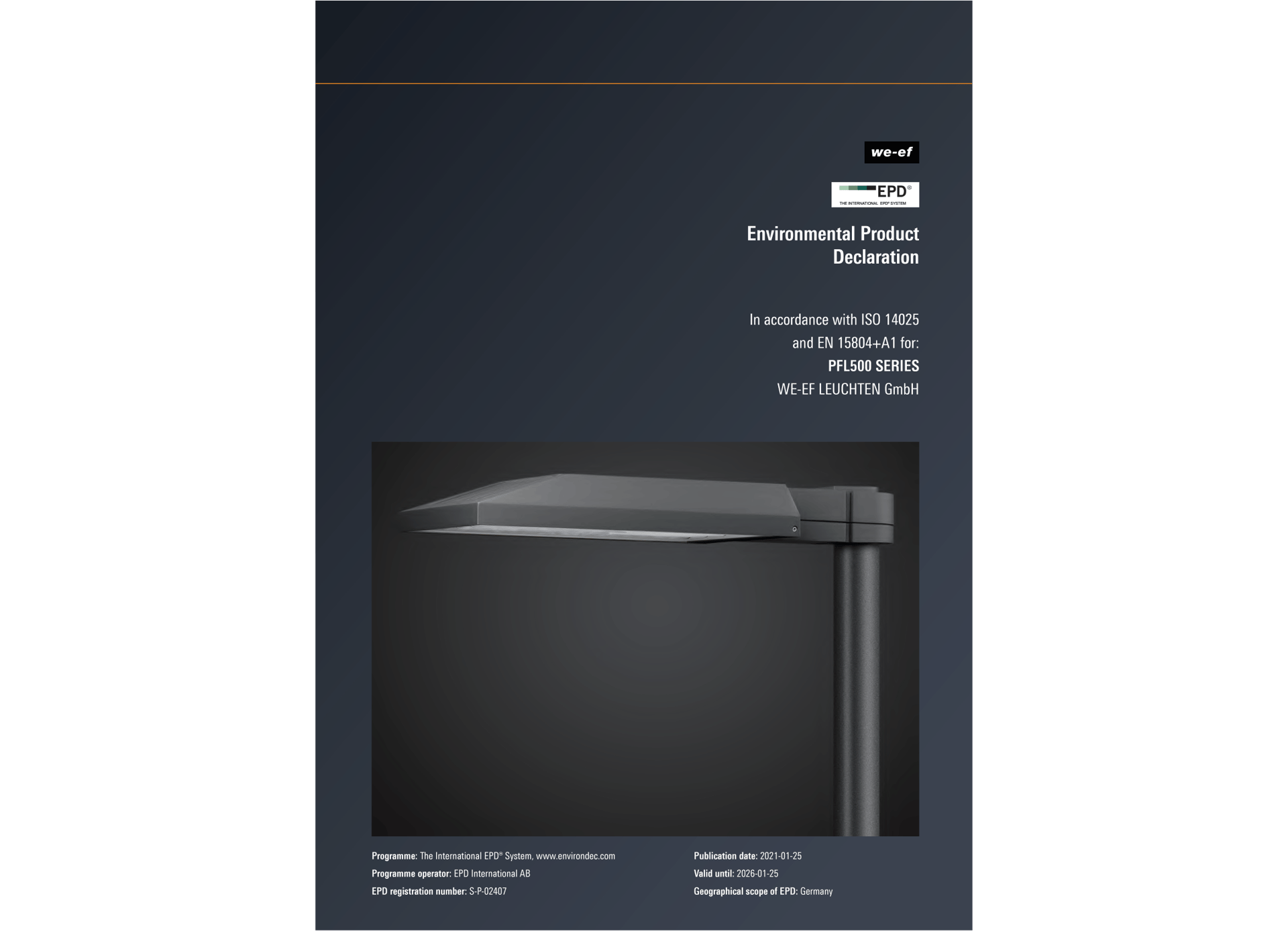 EPDs sind produktspezifische Datenblätter, die nachprüfbare, vergleichbare Informationen über die Umweltauswirkungen eines Produkts enthalten. Sie dokumentieren den Umwelteinfluss eines Produkts nicht nur für die Zeit, in der es genutzt wird, sondern über den gesamten Produktlebenszyklus von der Rohstoffgewinnung über Installation und Betrieb bis zum Recycling. Die EPDs von WE-EF stellen gemäß den internationalen ISO 14025 und EN 15804 Normen eine ausführliche Dokumentation zum ökologischen Fußabdruck der Außenleuchten über alle Phasen ihres Lebenszyklus hinweg dar. Aktuell arbeitet WE-EF dafür mit unabhängigen Experten für Life Cycle Assessments wie Thinkstep (www.thinkstep-anz.com) und Plattformen wie The International EPD® System (www.environdec.com) zusammen. Zu den untersuchten Einflusskategorien gehören Aspekte wie Versauerungspotenzial, Eutrophierungspotenzial, Treibhaus-Potenzial, Ozonschicht-Abbaupotenzial, Sommersmog-Schöpfungspotenzial, Erschöpfung nicht-energetischer Ressourcen und Erschöpfung fossiler, nicht erneuerbarer Energieträger.